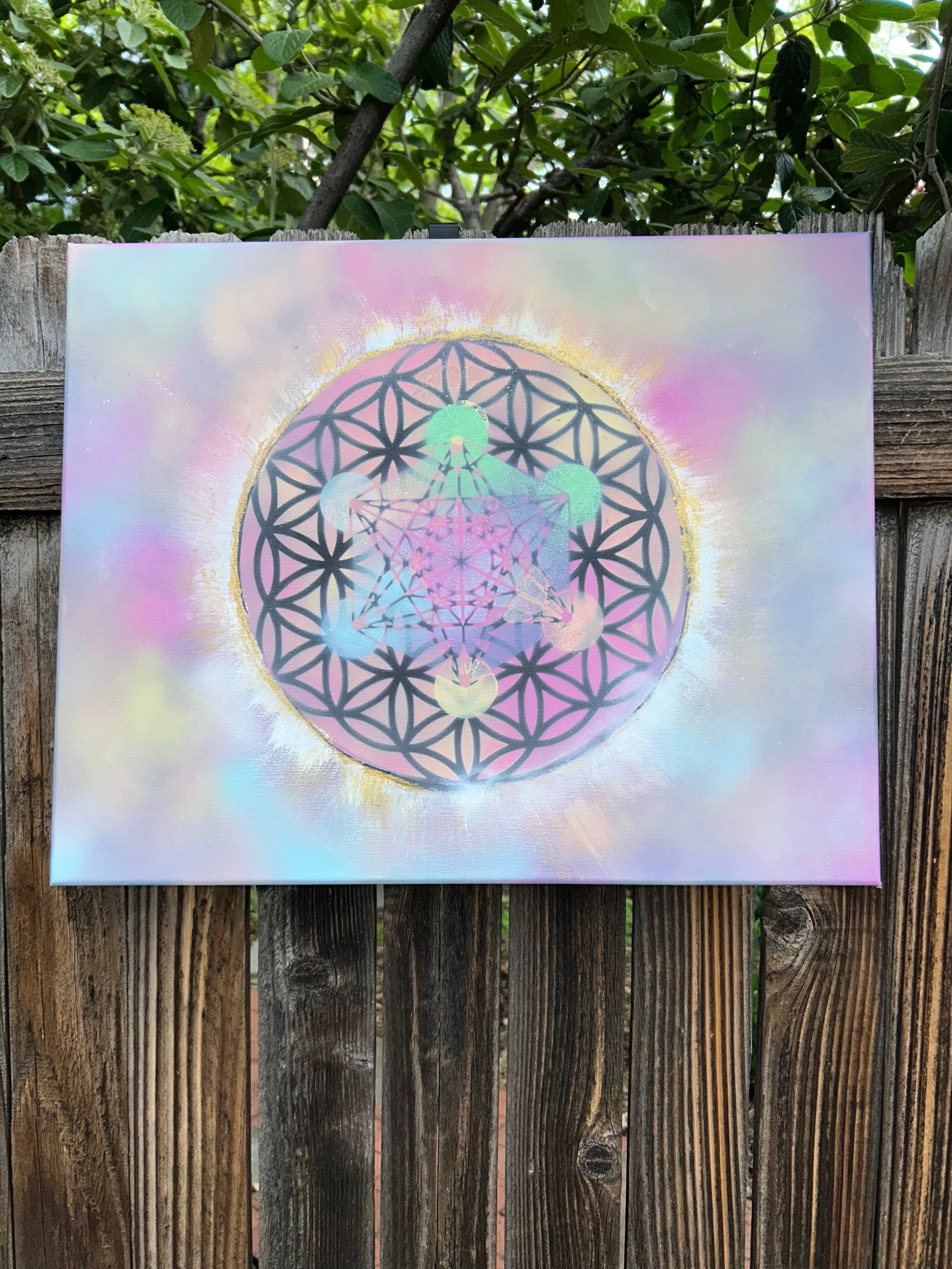 Layered above it is Metatron’s Cube, softly expressed in lighter pastel tones. This form brings another dimension to the piece: sacred structure, balance, and protection. Its presence suggests both the architecture of creation and the quiet safety of being held within something greater than the thinking mind can fully grasp. I intentionally preserved a darker outline around the geometry to evoke the feeling of something crossing from the unseen world into the visible one.
